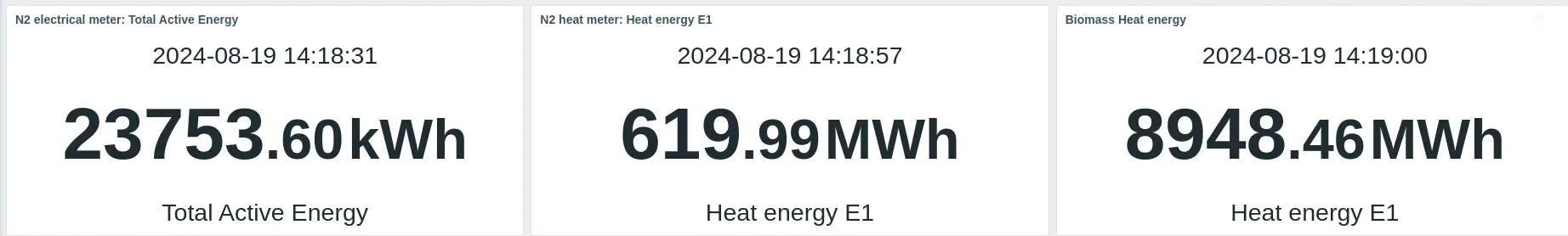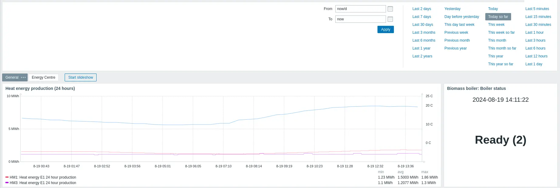 Zabbix makes it possible to automatically record data from your meters and other devices, at any desired schedule. On this project, most of the readings are made every minute, giving a high amount of visibility into energy production and use. Zabbix allows the end-user to select which time period there are interested in, to easily see reports on what they are interested in. The end-users have the ability to build dashboards which contain the data they are reguarly interested in. For example, see a part of a dashboard below that I built which gives a quick look at a boiler’s heat production, building heat use, and exterior temperature over time.