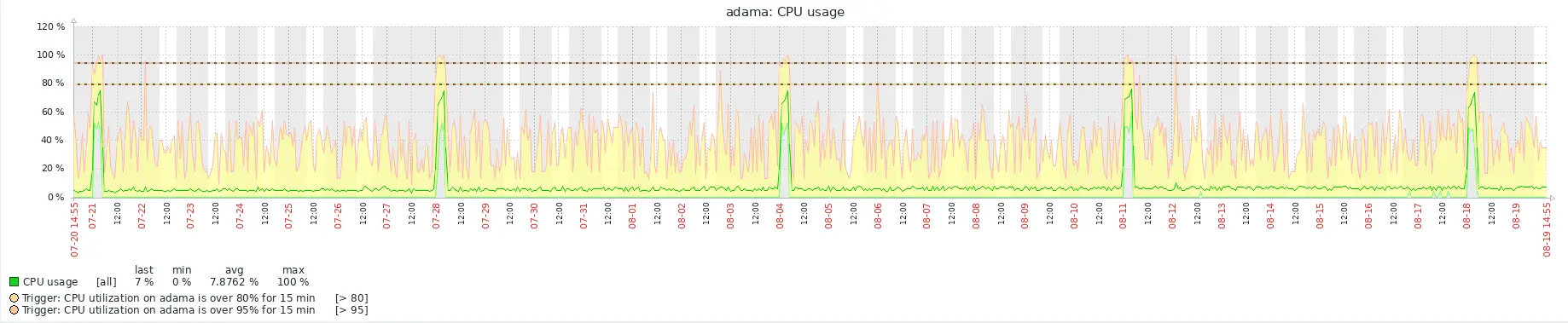 Monitoring IT resources is the more-common use of Zabbix, I used the same server to monitor network and server resources. You can see a graph of one of the server’s CPU usage below.